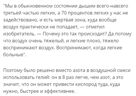 「なぜか?空気は重い」そして肺が良くなく、呼吸をするのは困難です。肺が病気になると検出される。したがって、空気混合物では窒素ではなくヘリウムを使用することにしました。これは、窒素よりも7倍軽いため、酸素を必要な場所にすばやく効率的に運ぶことができます。