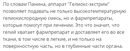 Panin氏によると、Heliox-Extremeデバイスは、高温のヘリウムと酸素の混合物を提供するだけでなく、治療に役立つ薬を提供することもできると。これはヘリウムが薬を肺を含むすべての組織に送達することを意味します。臓器の表面部分だけでなく、臓器の深くまでも送達されます。