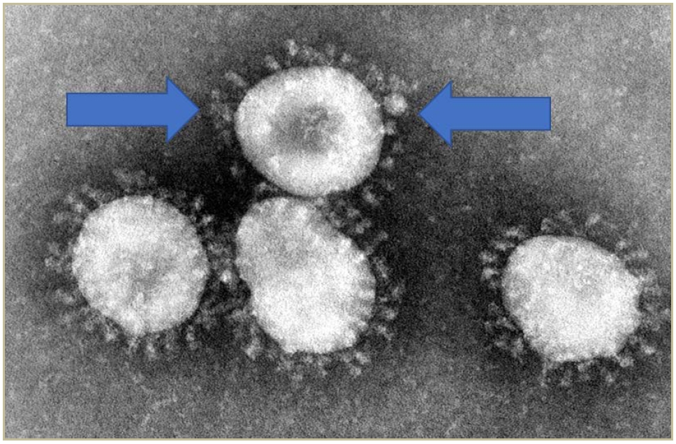 図1.典型的なコロナウイルス科の電子顕微鏡写真。 青い矢印は、キャプシドの周りにハローまたはコロナを形成する外部糖タンパク質を示しています。 未知の作者による写真は、CCBY-SAクリエイティブコモンズの下でライセンスされています。