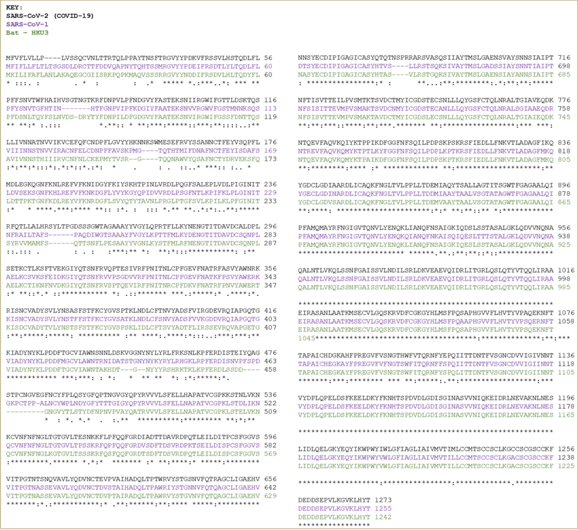 図2.ウイルススパイクタンパク質のアミノ酸配列アラインメント。 SARS-CoV-2(Covid-19)は黒、SARS-CoV-1(SARS)と人獣共通感染症は紫、コウモリ由来のHKU3は緑です。アステリックス(*)は、シーケンスの変更がないことを示します。(:)は、Covid-19配列におけるアミノ酸の保存された変化を示します。 (空白)は、3つの種すべてにわたるアミノ酸の変化を示します。(–)は省略されたアミノ酸を示します。Protein sequences obtained from https://www.uniport.org