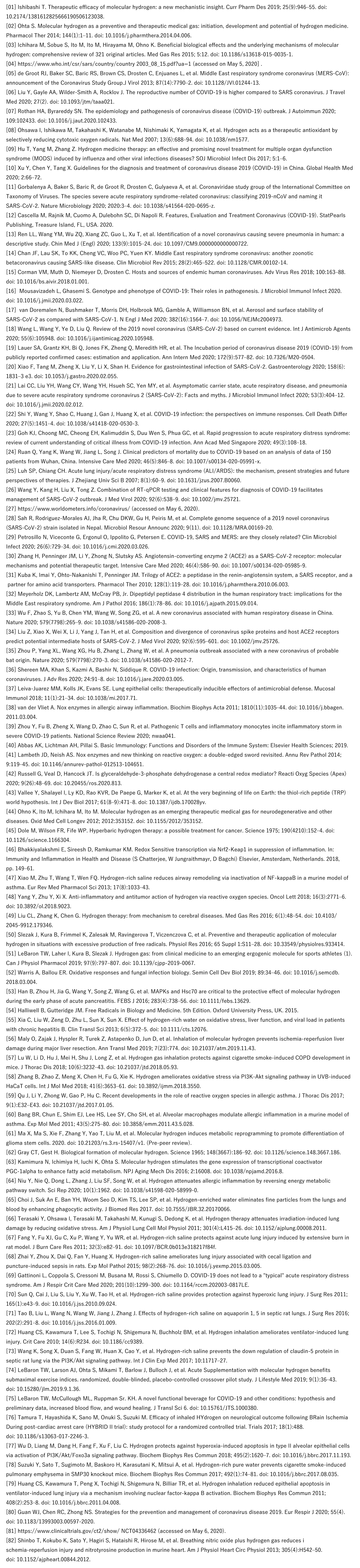 その結果、呼吸興奮薬の投与量で無害であることが示されているH2の適用は、重症患者に対するCOVID-19の治療におけるO2吸入への効果的な補助薬を提供する可能性があります。この方法は、中華人民共和国[10]で推奨され、実践されており、酸素/水素混合ガスは呼吸困難を大幅に軽減することが知られています[80]が、他の場所では広く使用されていません。現在までに、COVID-19感染症の治療にオキシ水素を使用した1つの臨床試験のみが米国国立医学図書館に登録されており、さらに4つの臨床試験がCentre for Evidence-Based Medicine(CEBM)に登録されています。 [81]。したがって、この前例のない世界的大流行に照らして、ウイルス感染の差し迫った脅威だけでなく、肺炎、喘息、COPDなどの他の炎症性呼吸器疾患に対するH2の影響をさらに調査することが賢明です。および嚢胞性線維症。 H2はNO•[75]と相乗的に作用して、心臓梗塞の動物モデル中のROS過負荷および顆粒球浸潤と戦うことも実証されているため[82]、水素療法と他のiatricガス。