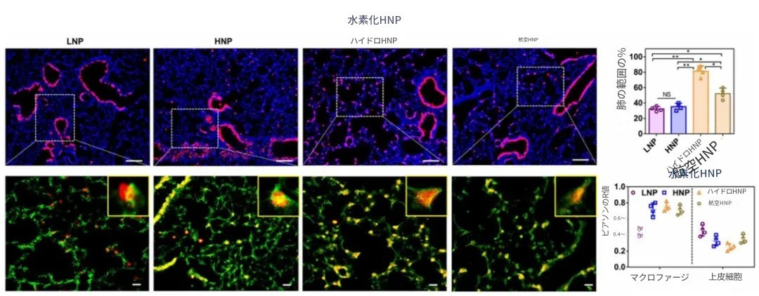 さらに、研究チームは、pH依存で電荷反転する脂質膜をアポトーシスT細胞膜とハイブリッド化して、エンドソームからの脱出効率を高め、肺修復を促すマクロファージの活性化を狙ったハイブリッド脂質ナノ粒子(HNP)を開発しました。