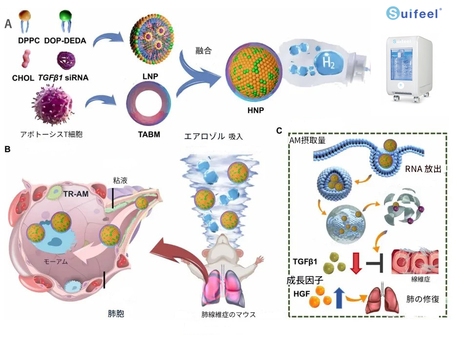 また、水素酸素混合ガス吸入器によって供給される水素が、ナノ粒子と粘液の相互作用を分断し、HNP/TGFβ1 siRNAの線維化病変部への沈着を促進し、線維化シグナル伝達を阻害。